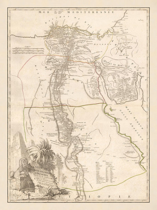 El mapa está adornado con un elaborado cartucho, que presenta representaciones alegóricas de las Pirámides, la Esfinge y otros símbolos del antiguo Egipto. Este elemento decorativo añade una capa de elegancia artística, atrayendo la mirada del espectador y proporcionando un ancla visual para la narrativa histórica representada. La detallada grabación muestra el sinuoso camino del río Nilo, su delta fértil y los desiertos circundantes, ofreciendo una vista completa de la geografía de la región. La inclusión de templos antiguos y ruinas enriquece aún más el mapa, proporcionando información sobre el patrimonio arquitectónico y cultural de Egipto.