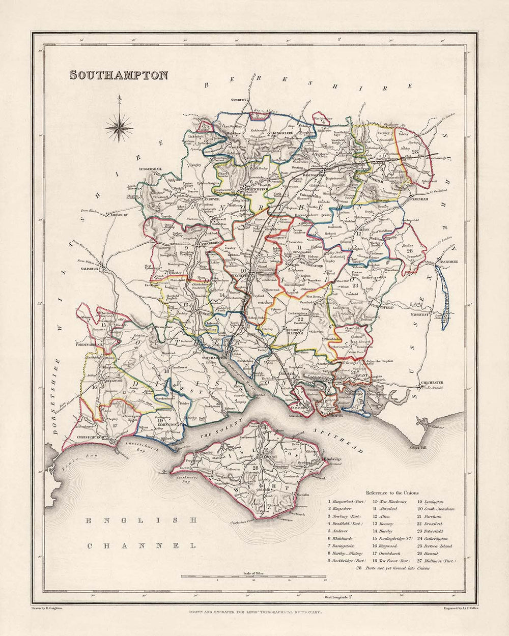 Antigua mapa del condado de Southampton (Hampshire) por Samuel Lewis, 1844: Winchester, Portsmouth, Basingstoke
