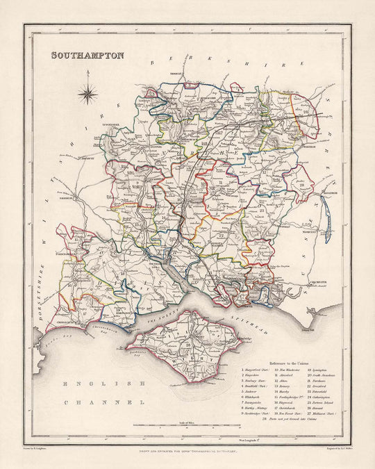 Tener este antiguo mapa del Condado de Southampton te permite profundizar en el pasado y explorar las fronteras históricas, asentamientos notables y características naturales de esta cautivadora región en Inglaterra. Es una pieza valiosa para los entusiastas de la historia, aficionados a la cartografía y cualquier persona que aprecie la belleza y la importancia de los mapas antiguos.