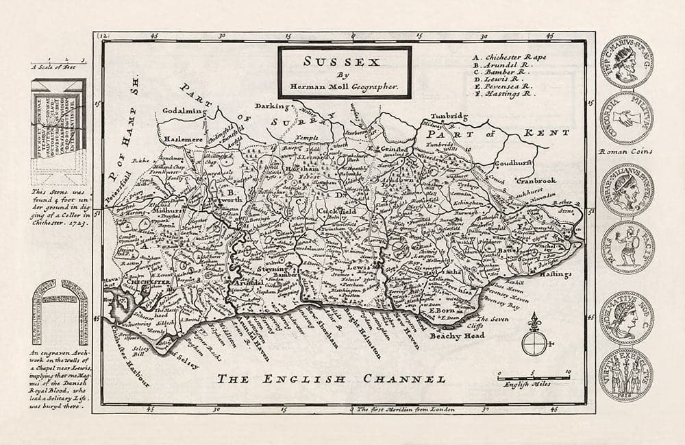 1724 Old Sussex Map, Herman Mohr Worthing, Crowley, Brighton, bognor, Eastbourne