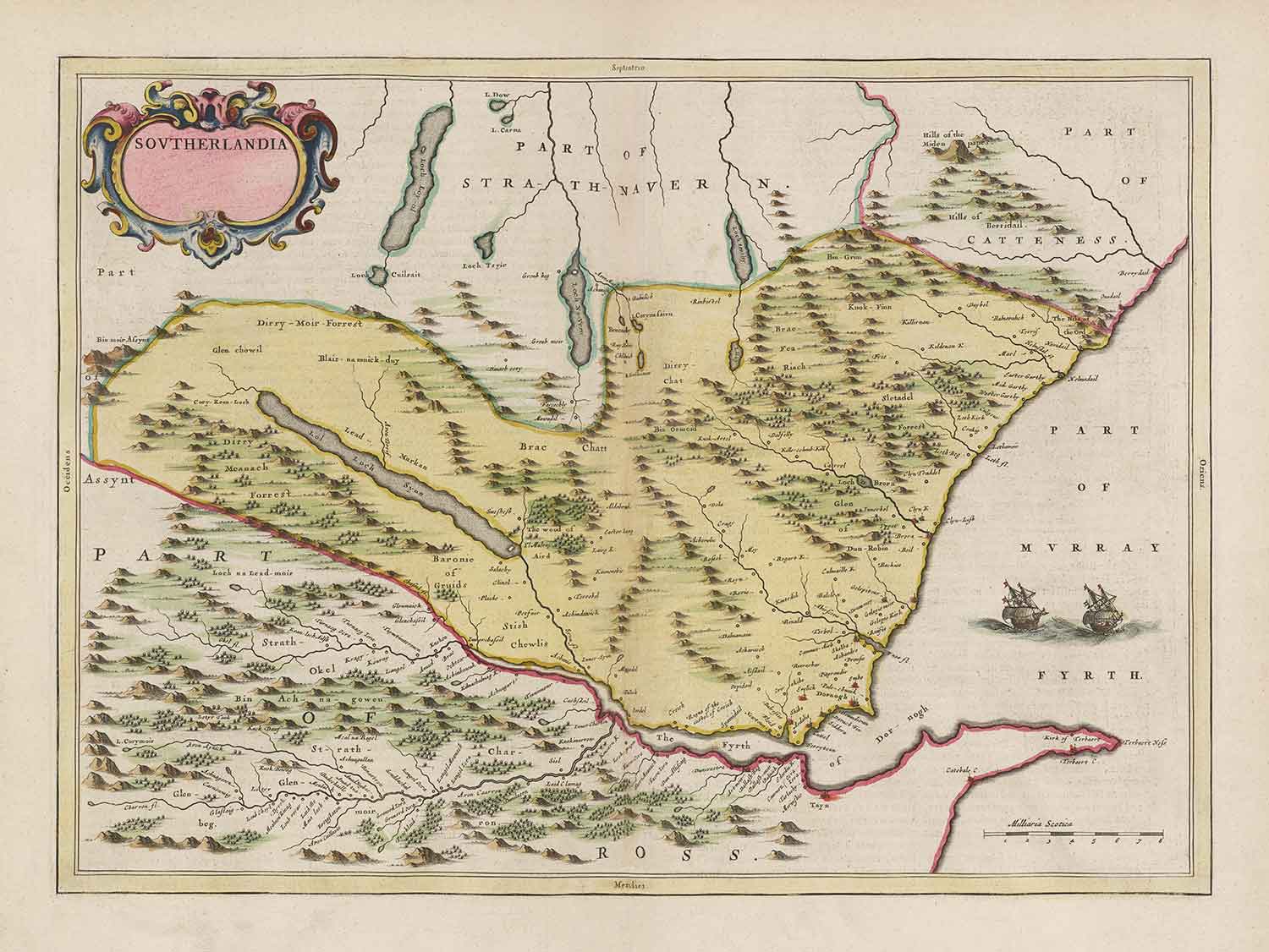 Antiguo mapa de Sutherland en 1665 por Joan Blaeu: Dornoch, Tain, Brora, Skelbo, Helmsdale