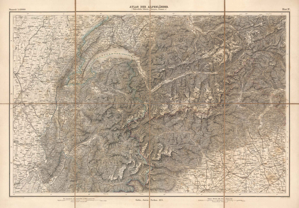 Con más de 190,000 km2 de tamaño y rodeado por ocho países, los Alpes cuentan con algunos de los picos más altos de Europa. Este mapa es la hoja 4 de 11 del "Alpen-Atlas de Mayr".
