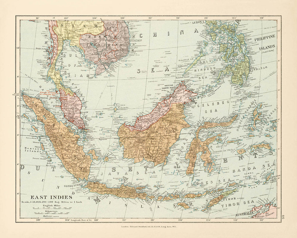 El mapa de las "Indias Orientales", elaborado por la renombrada Edward Stanford Ltd. en 1926, es una fascinante visión de los paisajes geopolíticos y geográficos del sudeste asiático durante principios del siglo XX. Este mapa, parte del prestigioso atlas de geografía universal de Stanford en Londres, refleja la meticulosa artesanía y la experiencia cartográfica por la que Edward Stanford Ltd. fue celebrada. El mapa delinea bellamente las fronteras políticas de la época, ofreciendo una instantánea histórica de regiones que incluyen la actual Indonesia, Malasia, Brunei, Singapur, Timor-Leste y Filipinas, así como partes de Tailandia, Camboya y Vietnam.