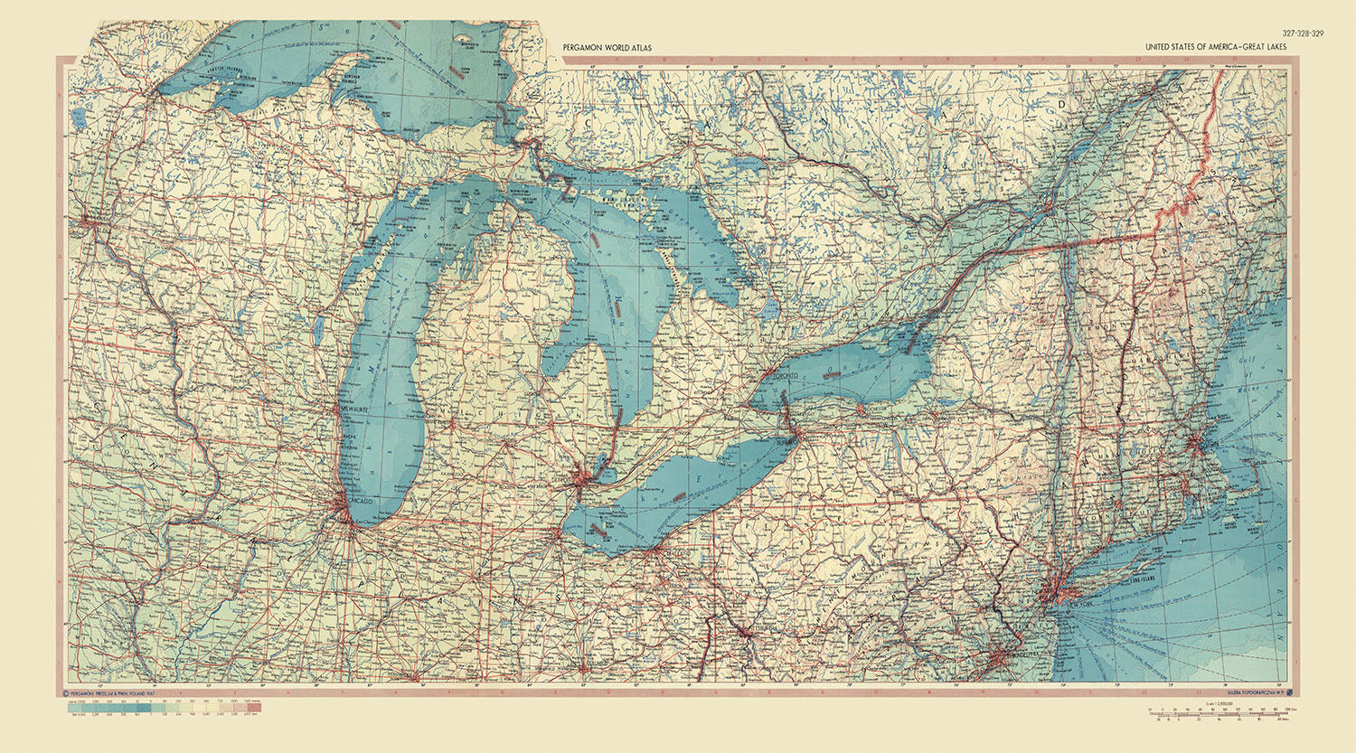 Sumérgete en los intrincados detalles del mapa 'Estados Unidos de América - Grandes Lagos', una fascinante obra maestra cartográfica de los archivos del Servicio de Topografía del Ejército Polaco, publicada en 1967. Este no es solo un mapa, sino un rico tapiz de historia, geografía y arte que te invita a explorar el cautivador terreno de la región de los Grandes Lagos. El mapa es una excelente representación de las características políticas y físicas de la región, con cada uno de los Grandes Lagos - Michigan, Huron, Ontario, Erie y Superior - bellamente representados. Este mapa, con su detallada representación de los Grandes Lagos, se extiende hasta Boston en el este, Quebec en el norte, Minneapolis en el oeste y Indianápolis en el sur.
