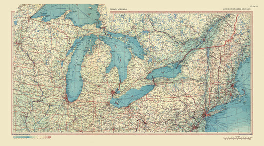 El Lago Huron, famoso por su archipiélago de islas, es otro punto focal de este mapa. La intrincada costa del lago y las ciudades que se asientan a lo largo de sus orillas están meticulosamente ilustradas. El Lago Ontario y el Lago Erie, el más oriental y el más meridional de los Grandes Lagos, respectivamente, también están destacados de manera prominente. Estos lagos, con sus bulliciosos puertos y sitios históricos significativos, juegan un papel crucial en el comercio y la historia de la región.