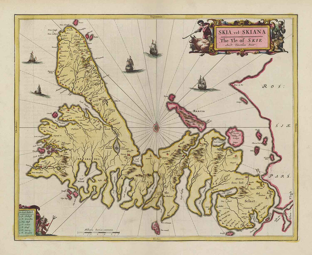 Antiguo mapa de la isla de Skye en 1665 por Joan Blaeu: Portree, Raasay, Soay, Scalpay, Dunvegan