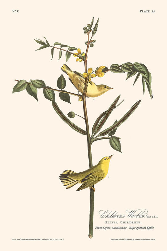 Sumérgete en el mundo de la belleza aviar con "Children's Warbler", una pieza exquisita del renombrado naturalista y artista John James Audubon, publicada originalmente en 1827. Esta obra forma parte de la colección emblemática de Audubon, "Birds of America", celebrada por sus representaciones detalladas y a tamaño real de las aves de América del Norte.