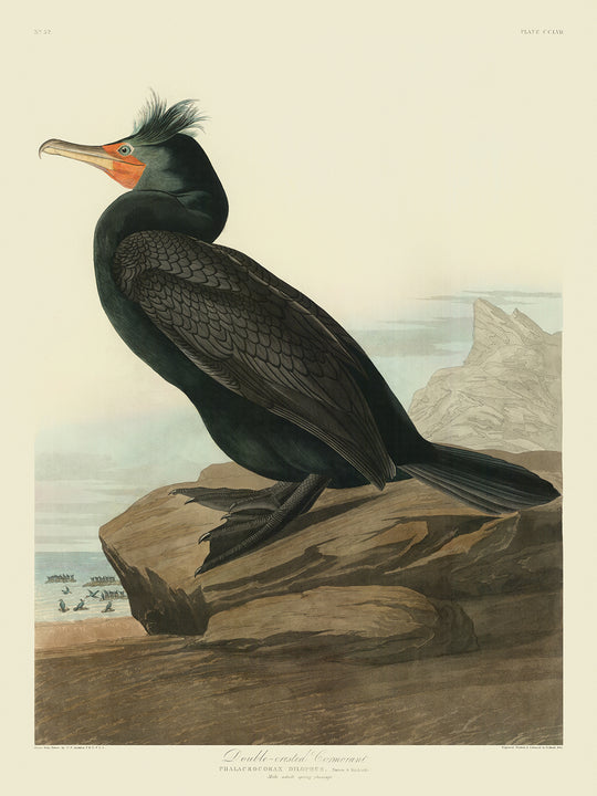 El cormorán de doble cresta, publicado por primera vez en 1827, es una representación excepcional de la monumental obra de John James Audubon, Las Aves de América. Esta ilustración meticulosamente detallada captura al cormorán de doble cresta en todo su esplendor, destacando el plumaje distintivo de primavera del ave.