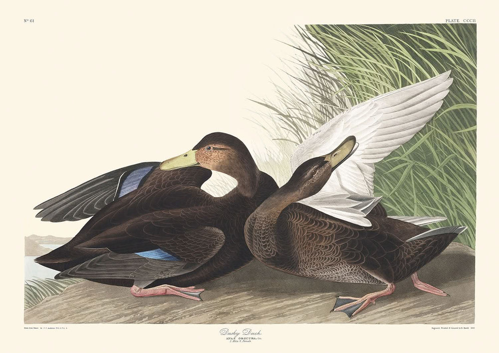 En la ilustración de Audubon, la interacción de colores naturales y detalles refinados resalta de manera única el plumaje del pato oscuro. Su uso de tonos marrones suaves y profundos en las plumas, sobre un fondo dinámico y naturalista, transporta a los espectadores a los entornos serenos que habitan estos patos. Esta impresión no solo agrega belleza natural a cualquier espacio, sino que también sirve como tema de conversación sobre la diversidad y el esplendor de la vida aviar.