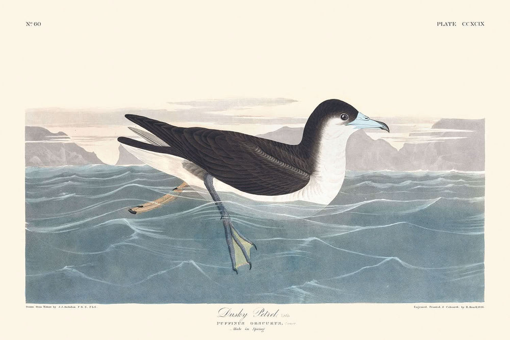 El Petrel Sombrío, ilustrado por primera vez en 1827 por el renombrado John James Audubon, captura la serena fluidez de esta elegante ave marina de la eminente serie de Audubon, "Aves de América." Esta obra refleja un momento cautivador observado en el Golfo de México, donde estas aves mostraron comportamientos intrincados en medio de las aguas, reflejando la atención al detalle y la expresión vívida características de Audubon.