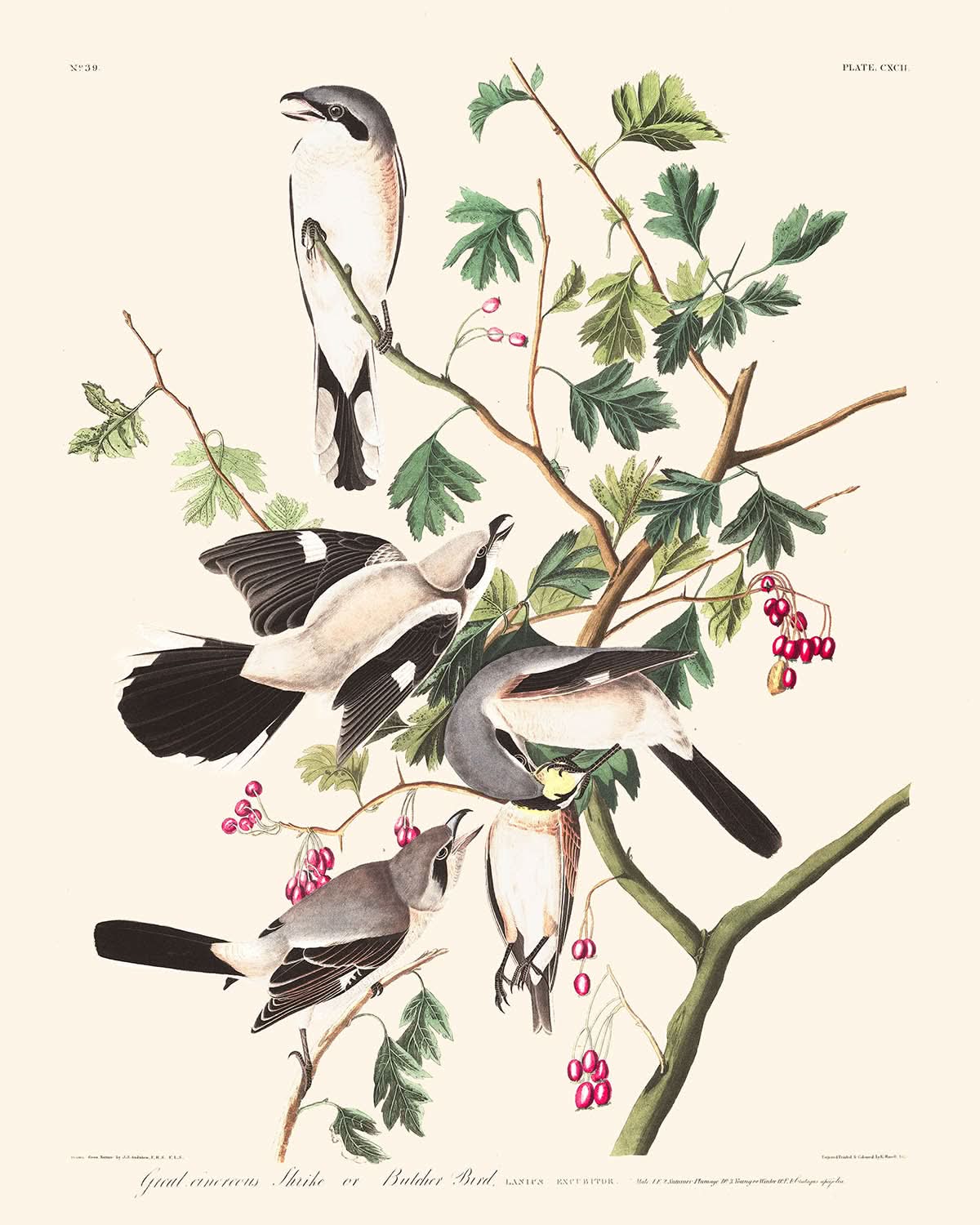 La representación artística de esta especie maravilla con sus tonos bien definidos y su elaborada composición. Curiosamente, el alcaudón parece imitar los llamados de socorro de otras aves para atraer a sus presas, un comportamiento que Audubon narra vívidamente. Poseer una impresión artística de esta ilustración no solo rinde homenaje a esta curiosa ave, sino que también conmemora el legado de Audubon como artista.