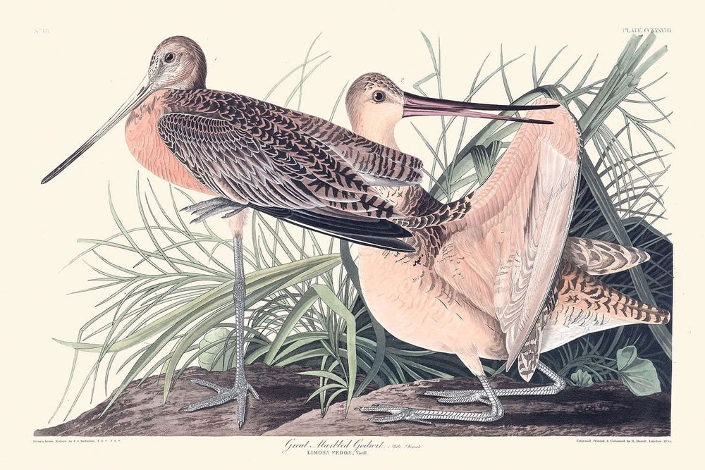 John James Audubon es venerado por su meticuloso enfoque de la ilustración de historia natural. Su trabajo fue pionero en la forma en que combinó la precisión científica con la expresión artística, convirtiendo la ilustración de aves en una forma de arte celebrada. La aguja jaspeada (Limosa fedoa), conocida por su característico pico largo y plumaje moteado, es un ejemplo perfecto de la habilidad de Audubon para capturar la belleza y los matices del comportamiento de sus sujetos.