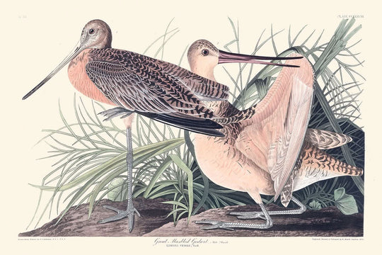 Además, la paleta de Audubon captura los matices sutiles del plumaje del zarapito, desde sus partes inferiores de un amarillo rojizo claro hasta las alas con dibujos de un negro parduzco. La rica coloración y la representación realista hacen de esta impresión una pieza extraordinaria que ofrece una visión de un mundo de vida salvaje casi perdido.