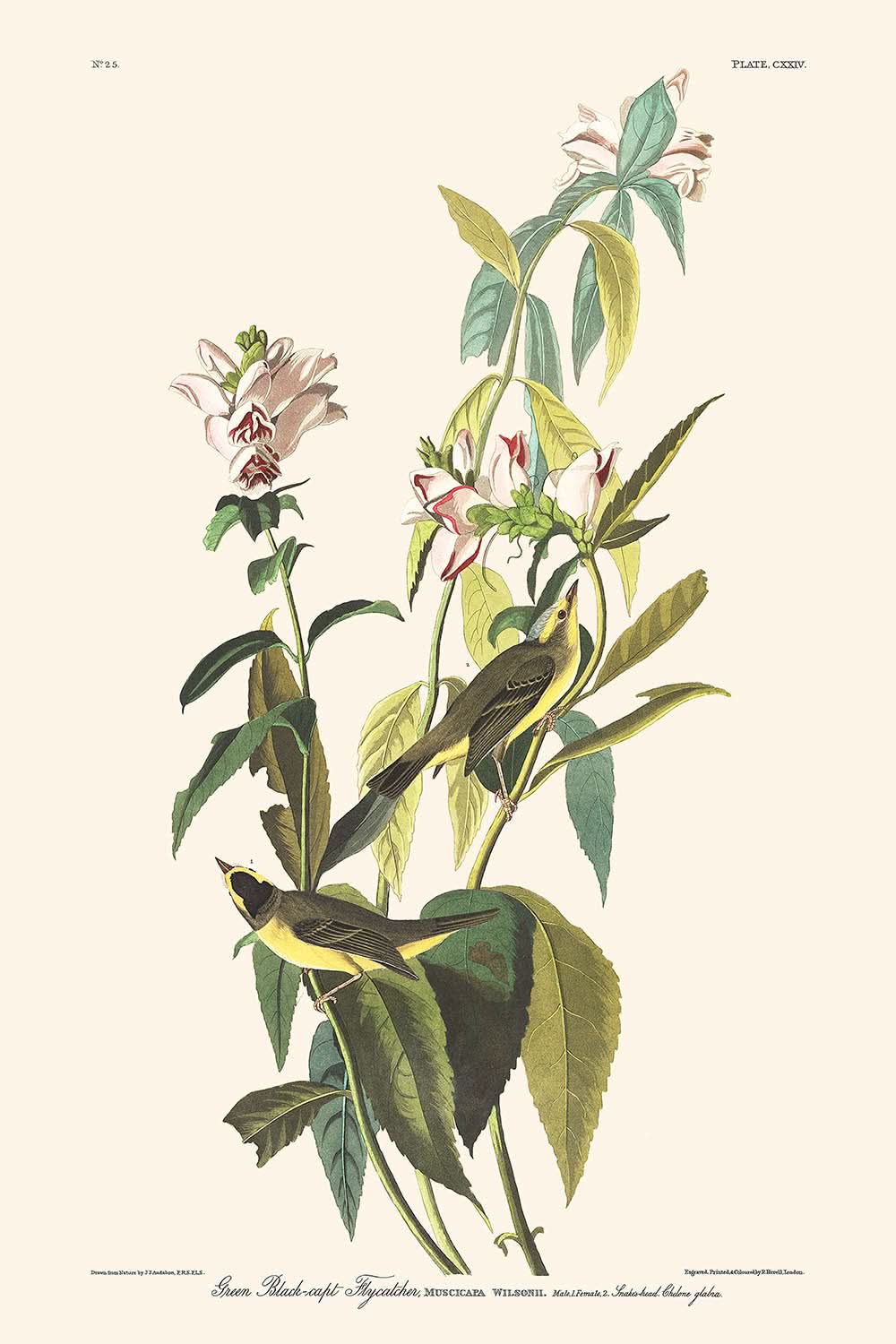 El "Papamoscas de cabeza negra verde" (Lámina 124) de John James Audubon, presentado por primera vez en 1827, es una exquisita ilustración de su famosa serie "Aves de América". Esta impresionante representación captura la intrincada belleza y la naturaleza delicada del papamoscas de cabeza negra verde, y muestra la capacidad incomparable de Audubon para retratar la vida de las aves con detalles vívidos y una vitalidad realista.