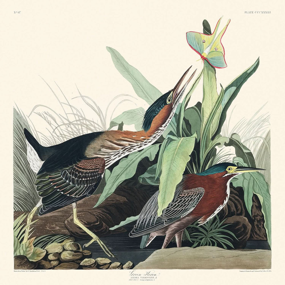 La Garza Verde de John James Audubon, publicada por primera vez en 1827, es una representación cautivadora de la famosa colección "Las aves de América". Apreciada por su meticuloso detalle y su representación vibrante de la vida aviar, esta ilustración muestra a la Garza Verde, una especie reconocida por su amplia distribución en América del Norte durante los meses más cálidos y sus intrigantes patrones migratorios.