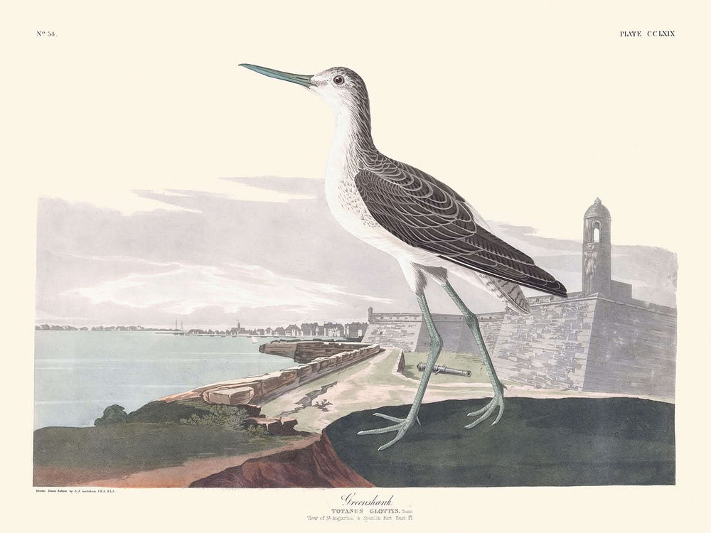 La ilustración del archibebe claro se destaca por su relevancia histórica y taxonómica, representando una especie de ave encontrada por Audubon durante su expedición a los Cayos de Florida en 1832. Las meticulosas notas de Audubon revelan una exploración profunda de los hábitos y hábitats del ave, vinculando su presencia documentada tanto en América como en Europa, un testimonio de las conexiones globales en la migración de las aves.