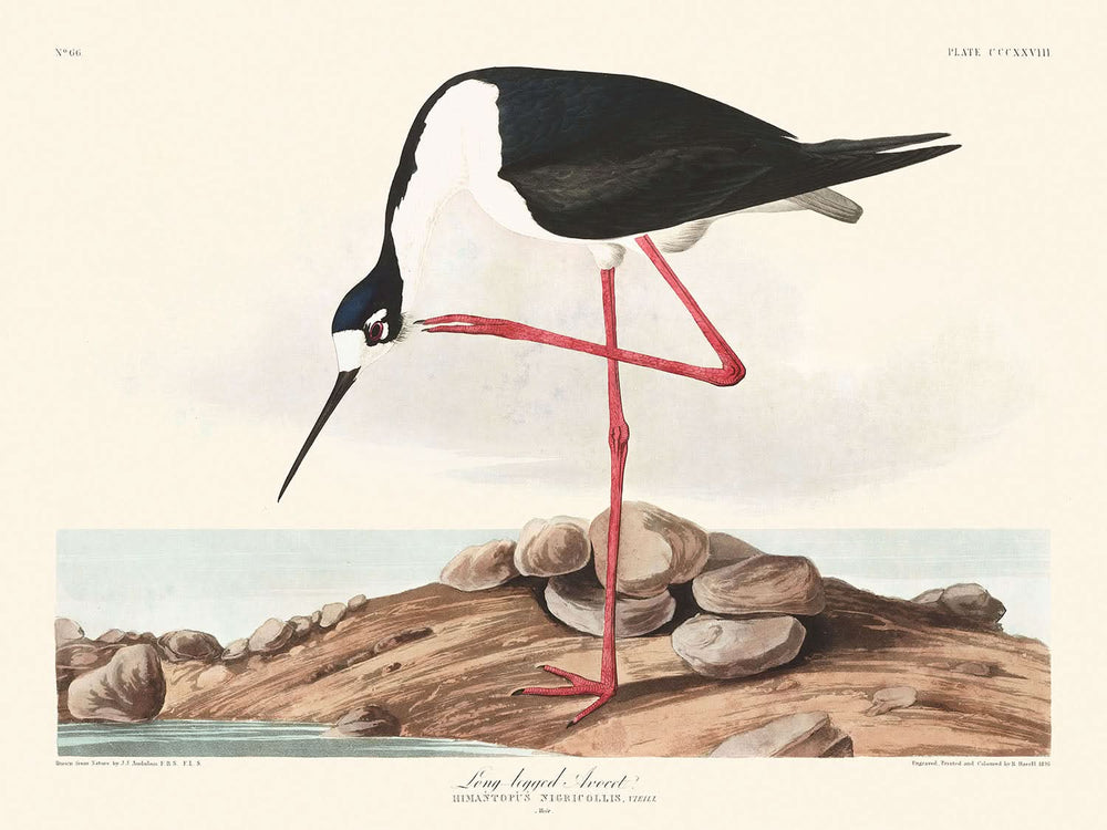 El Avocet de patas largas, publicado en 1827, es una cautivadora ilustración de aves de la renombrada colección de John James Audubon, Aves de América. Esta ilustración muestra la elegancia y las características distintivas del Avocet de patas largas, llamando la atención sobre sus patas delgadas y alargadas y su postura graciosa—un tributo a la habilidad de Audubon para capturar la esencia de la vida silvestre americana.