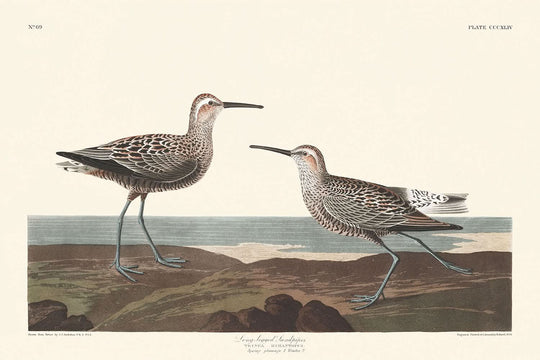 Presentamos "El playero patilargo" del reconocido naturalista y artista John James Audubon. Esta exquisita ilustración, publicada por primera vez en 1827, es una pieza notable de la célebre colección "Aves de América". La obra de Audubon es un testimonio de una era pasada de meticulosa observación natural y habilidad artística, que captura la belleza y la esencia del mundo aviar con un detalle incomparable.