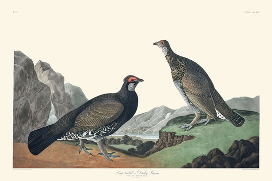El urogallo de cola larga o Tetrao obscurus está ilustrado con sumo cuidado, revelando las sutilezas de su morfología y plumaje. El hábitat de esta ave se extiende desde las Montañas Rocosas hasta el río Columbia, lo que proporcionó un rico contexto para la interpretación de Audubon. La obra de arte se complementa con observaciones de los primeros naturalistas, lo que agrega una profundidad científica a su belleza artística.