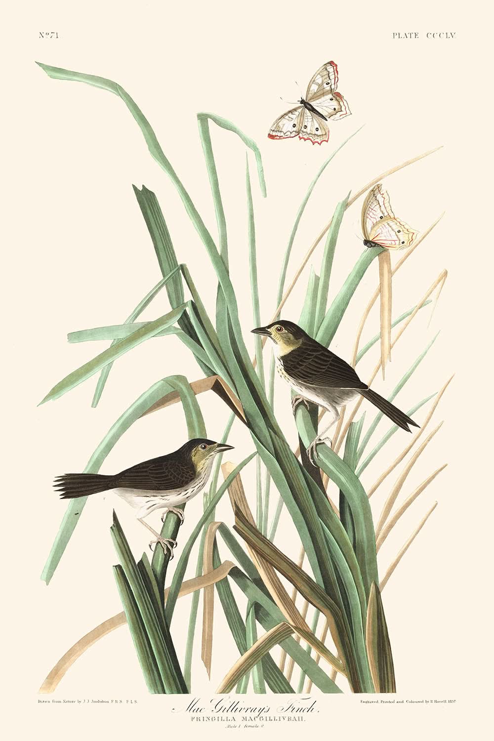 El pinzón de MacGillivray de John James Audubon, publicado en 1827, es un ejemplo exquisito de la distinguida colección, Aves de AméricaEsta ilustración en particular revela la representación magistral de Audubon del pinzón de MacGillivray, un ave conocida por su esquiva presencia en las marismas del Atlántico Sur.