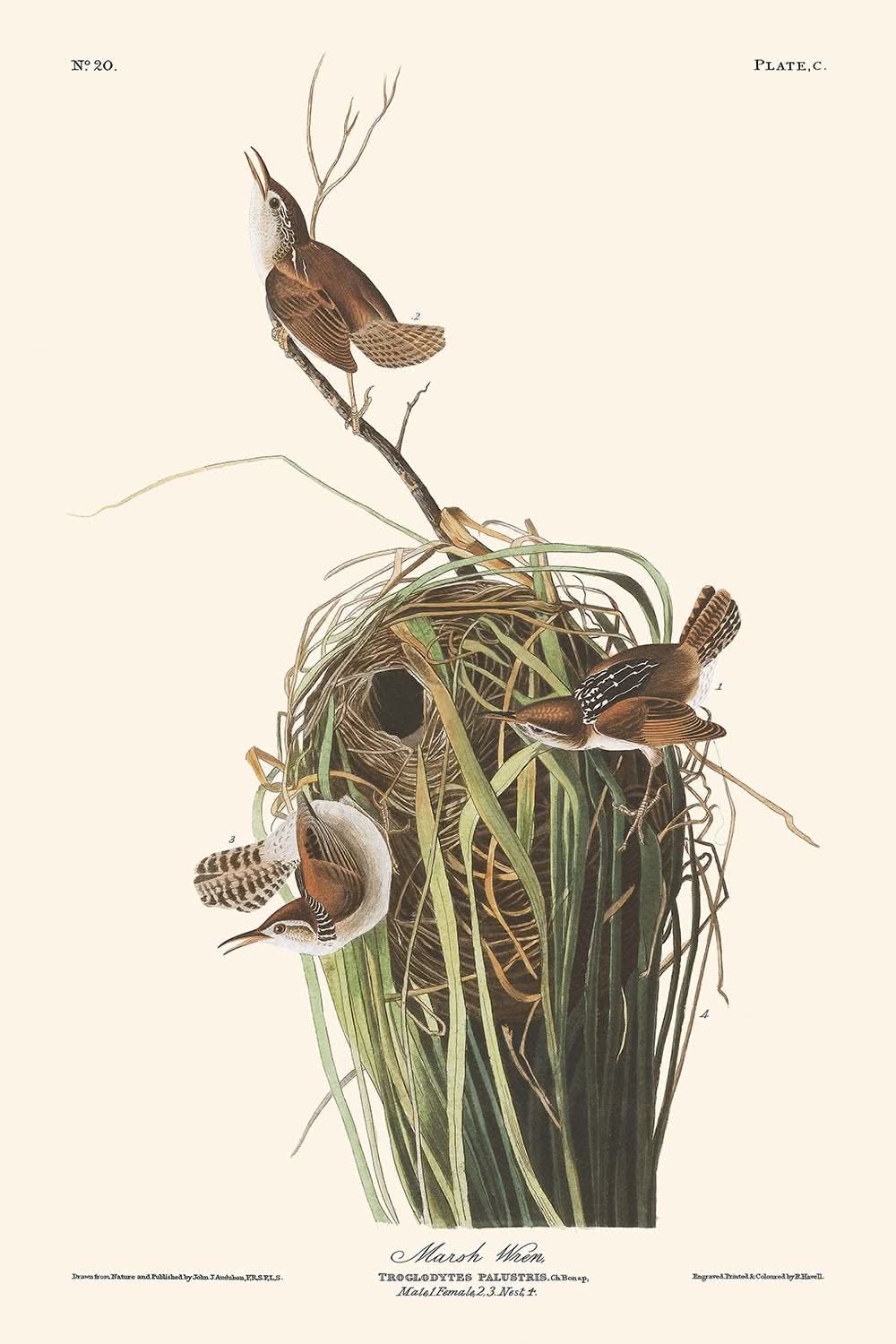 John James Audubon, célebre por su exquisita atención a los detalles ornitológicos, da vida al cucarachero lagunero, conocido científicamente como Trogloditas palustrisEl trabajo de Audubon continúa siendo una piedra angular del arte de la historia natural estadounidense debido a sus representaciones precisas y realistas de especies de aves de América del Norte.