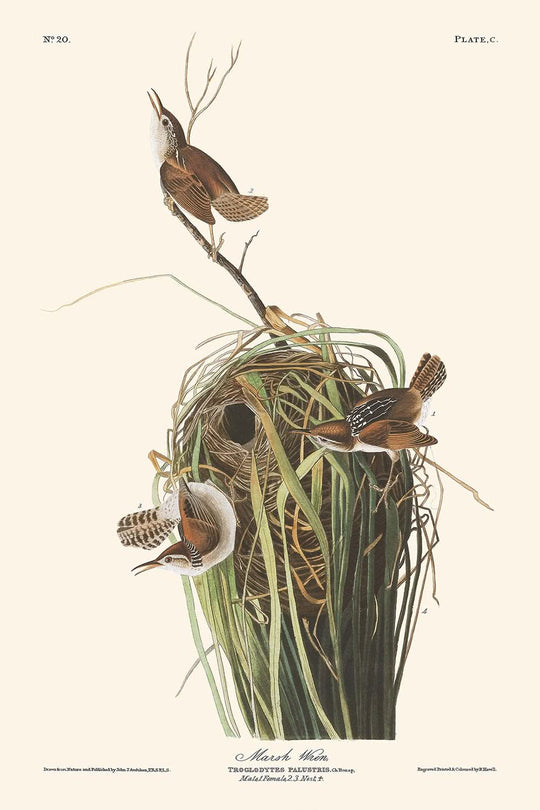 El cucarachero de pantano, publicado por primera vez en 1827, es una de las fascinantes ilustraciones de aves de la famosa serie de John James Audubon, The Birds of America. Esta obra de arte en particular captura la esencia del cucarachero de pantano, y muestra su hábitat natural a lo largo de las costas del Atlántico y las marismas en las entradas de los ríos.