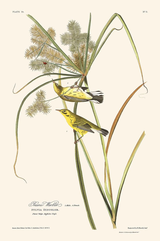 Con su llamativo plumaje amarillo y verde y las manchas de color castaño rojizo características del macho, la reinita de las praderas es un testimonio del hábil uso del color de Audubon que sumerge al espectador en el mundo natural de las aves. Poseer esta impresión no solo es un tributo al genio artístico de Audubon, sino también una celebración del intrincado equilibrio de la naturaleza. Esta impresión de bellas artes es un regalo distinguido, perfecto para cumpleaños, Navidad, el Día del Padre o cualquier ocasión para celebrar el amor por el arte o el mundo natural.