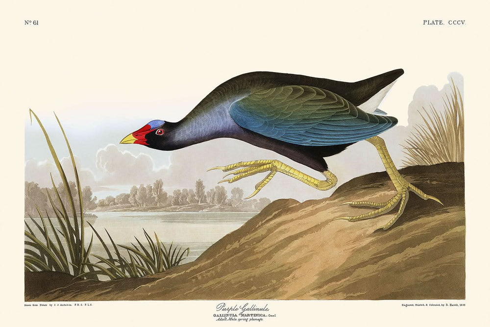Audubon, un aclamado naturalista y pintor, revolucionó el arte ornitológico con sus ilustraciones realistas. La serie "Aves de América", publicada por primera vez entre 1827 y 1838, consta de 435 grabados de tamaño natural que siguen siendo incomparables en cuanto a su alcance y calidad artística. La propia Gallinula purpúrea está etiquetada correctamente como Gallinula porphyrio o Gallinula martinica, lo que demuestra un conocimiento magistral de su biología y comportamiento.