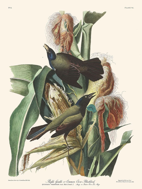El Grackle Púrpura, o Mirlo Común, creado por el renombrado ornitólogo y pintor John James Audubon, fue publicado por primera vez en 1827 como parte de la innovadora colección, Aves de América. Esta ilustración captura el rico plumaje y el intrigante comportamiento del Grackle Púrpura, un ave que Audubon describe vívidamente participando en sus tendencias naturales.