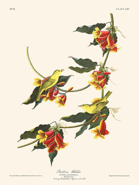 La reinita de Rathbone tiene un significado personal para Audubon, ya que la nombró en honor a la familia Rathbone de Liverpool, cuya generosidad influyó profundamente en su vida. Esta especie, descubierta por Audubon en un encuentro singular, está descrita de manera sorprendente con un plumaje amarillo brillante contrastado por tonos oliváceos, que contrastan con las delicadas flores carmín de la Bignonia capreolata.