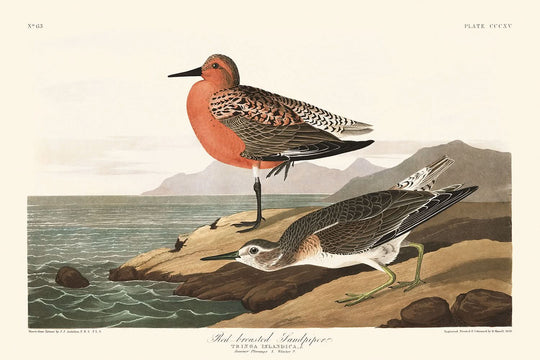 John James Audubon es reconocido por su aguda observación y su destreza artística, que le permitieron captar los intrincados detalles y el vibrante plumaje de las aves. El playero pechirrojo no es una excepción: esta ilustración transporta al espectador al vívido mundo de los hábitats costeros que el playero frecuenta durante sus viajes migratorios.