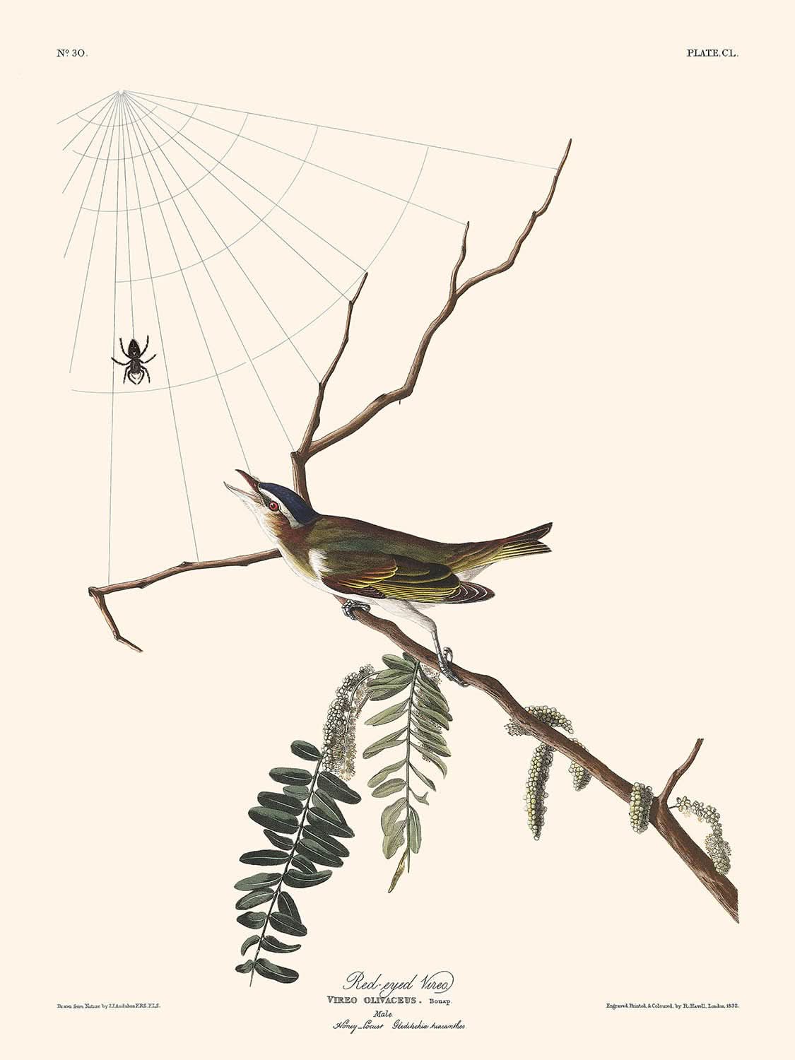 El Vireo de ojos rojos se distingue por sus exuberantes tonos oliva y gris contrastados con vibrantes ojos rojos. La representación realista refleja la aguda observación de Audubon sobre el comportamiento del pájaro, como su notable falta de la vibración de alas típica de los atrapamoscas, su vuelo bajo y ondulante, y su presencia melódica a lo largo de los bosques de América del Norte. Con notas atractivas sobre sus hábitos de anidación e interacciones con otras especies, esta ilustración es un testimonio completo del profundo respeto de Audubon por la naturaleza.