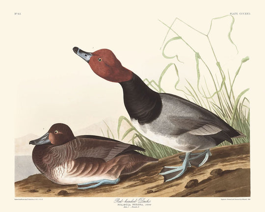 "El pato de cabeza roja", de John James Audubon, de 1827, captura la vibrante esencia del mundo aviar que se muestra en su famosa serie "Las aves de América". Audubon, ornitólogo y pintor autodidacta, es famoso por sus detalladas y majestuosas representaciones a tamaño real de aves autóctonas de América. "El pato de cabeza roja" es una espléndida síntesis de su dedicación a capturar no solo las complejidades de las formas de las aves, sino también su hábitat y comportamientos naturales.