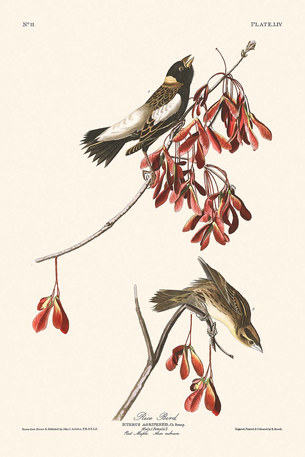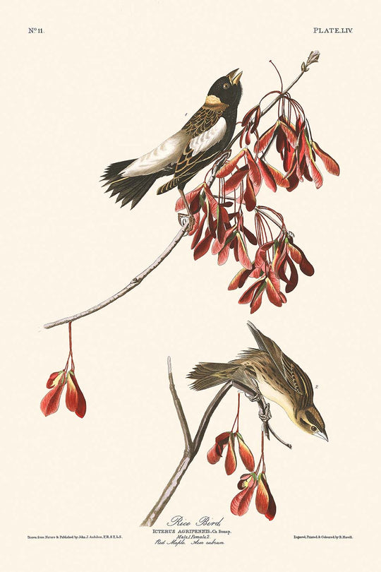 Como figura destacada de la ornitología y el arte estadounidense, John James Audubon fue celebrado por su intenso realismo y vívida representación artística de las aves. Su trabajo en "Aves de América" sirve como un invaluable repositorio de especies de aves que complementa tanto el estudio científico como la apreciación artística. La "Ave de Arroz (Placa 54)" representa a una de las aves migratorias que es tanto un deleite visual como auditivo en varias partes de los Estados Unidos.
