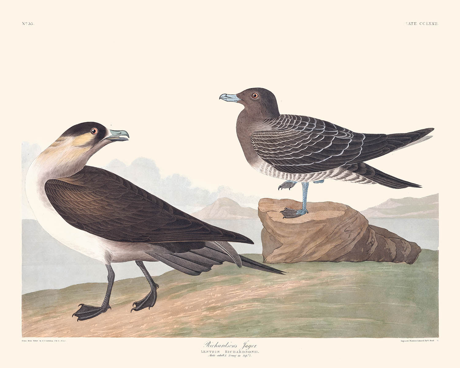 El renombrado ornitólogo y artista John James Audubon representó el majestuoso "Jäger de Richardson" como parte de su innovador trabajo, "Aves de América", publicado en 1827. Esta impresionante ilustración inmortaliza la rara presencia del Jäger de Richardson en las costas de América del Norte, especialmente detallada contra el nítido fondo invernal de Massachusetts y Maine.