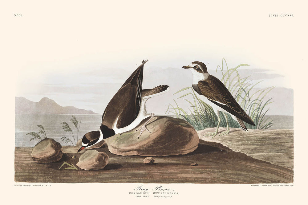 El "Ring Plover" ilustra el magistral uso del color y la composición de Audubon, con tonos de marrones suaves y blancos cremosos que reflejan la sutil belleza del ave contra el fondo natural atenuado. La representación realista captura no solo la delicada postura del ave, sino que también insinúa su comportamiento vivaz y sus distintos patrones migratorios a través de vastas distancias.