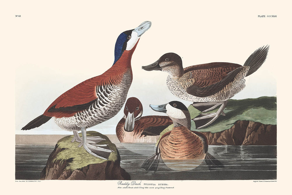 La sutileza de los colores, combinada con el uso experto de luz y sombra, hace que esta impresión no solo sea científicamente valiosa, sino también una notable pieza decorativa. Encierra la delicada interacción de la paleta de la naturaleza que Audubon observó a lo largo de las costas y humedales americanos. La obra de arte te atrae para apreciar la ferviente postura mientras cada pato está posado con sublime realismo y dinámica fluidez.