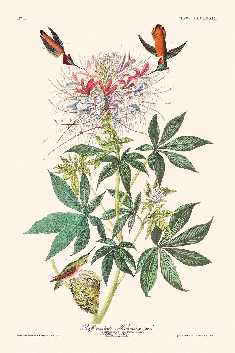 Esta impresión de colibrí cautiva con su increíble realismo y colorido vívido. Los ricos tonos de canela y verde esmeralda se yuxtaponen dramáticamente con el rojo ardiente de la garganta del pájaro, casi como una joya en su brillantez. El meticuloso detalle en el trabajo de Audubon otorga a cada pluma una textura realista, capturando la esencia etérea y la agilidad del pájaro en pleno vuelo. Junto a este exquisito pájaro se representa la planta Cleome heptaphylla, añadiendo más dimensión y contexto ecológico.