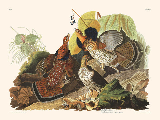 La "Ganga Rufa" de John James Audubon es una representación impactante del exquisito pájaro de su célebre serie "Aves de América" de 1827. Esta ilustración clásica captura la esencia del Tetrao umbellus, una especie elegante y esquiva que se encuentra en toda América del Norte. El intrincado detalle de Audubon no solo eleva la belleza natural del pájaro, sino que también refleja el intenso estudio y dedicación del propio Audubon, un naturalista reconocido por su compromiso en capturar la avifauna norteamericana.