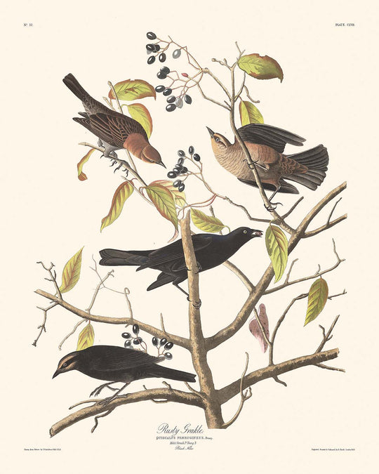 Audubon, estimado por sus meticulosas observaciones de campo y talento artístico, ganó reconocimiento por su capacidad para llevar la vitalidad de la vida aviar al lienzo. Esta impresión destaca el Grackle Oxidado, conocido científicamente como Gracula ferruginea. El Grackle Oxidado es conocido por sus patrones migratorios únicos, viajando a través de vastos territorios americanos en busca de terrenos óptimos para la cría y la alimentación.