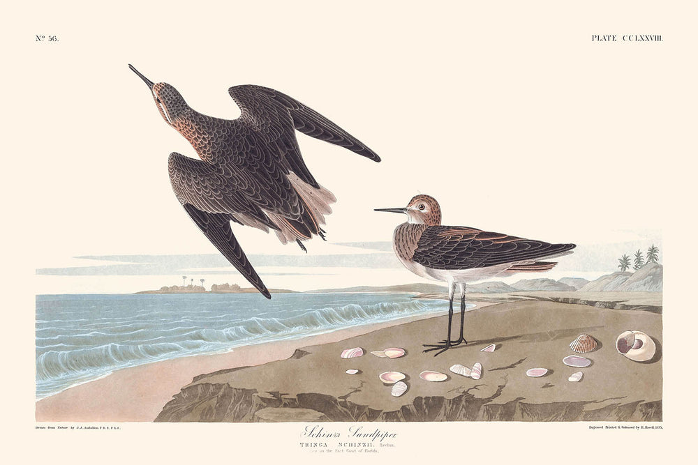 John James Audubon, un célebre ornitólogo y artista, es notable por su extenso estudio y representación artística de las aves de América del Norte. "El Playero de Schinz" tiene una importancia particular debido a la detallada narrativa de Audubon sobre la especie, ejemplificando su dedicación a la ornitología. La pieza destaca la naturaleza gentil y los patrones de vuelo únicos del Tringa Schinzii, como Audubon documentó durante su tiempo en el Este de Florida.