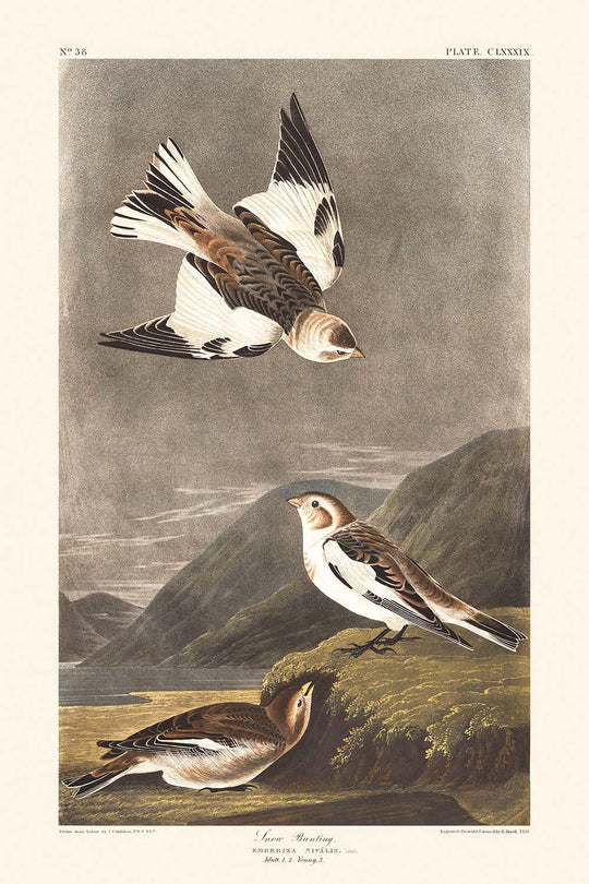 Esta obra de arte refleja el estilo distintivo de Audubon, donde el Snow Bunting es representado en medio del austero telón de fondo estacional que forma parte de su narrativa migratoria. Las plumas blancas apagadas de las aves contrastan con sus sombras efímeras en la tierra tocada por el invierno, enfatizando su lucha y armonía con los ciclos de la naturaleza. La interacción visual entre estas aves, elegantemente compuestas contra un escenario que recuerda la suave luz del amanecer, muestra un uso hábil del color y la perspectiva que aporta profundidad y movimiento a la escena.