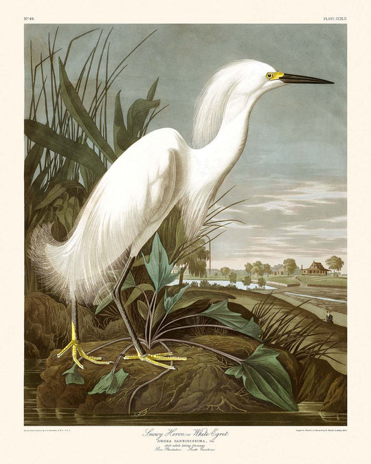 El uso del color en esta pieza es excepcional, con Audubon empleando blancos suaves y sutiles sombras para resaltar el plumaje de la garza contra una paleta suave. El diseño refleja la tranquilidad del hábitat del ave y captura la esencia de su presencia graciosa. Poseer esta impresión invita a la serenidad y sofisticación de las obras maestras de Audubon a tu hogar.