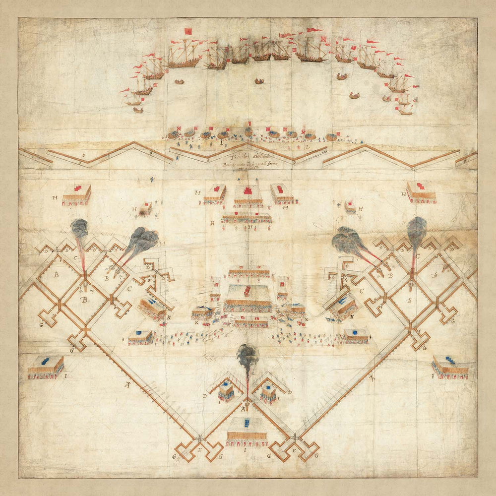 Notablemente, el diseño captura la dicotomía de la guerra mecanizada en medio de su entorno natural: los bloqueos navales se curvan hacia la costa, mientras los regimientos se mueven a través de un paisaje en retroceso. Las ilustraciones de fortificaciones y etiquetas narran un teatro en evolución de compromiso militar, completo con caminos anotados y trincheras curvadas — motivos no solo de defensa, sino de abandono estratégico. A medida que las letras A-L insinúan una narrativa más amplia probablemente discutida en círculos esotéricos de los ministros de la Reina Isabel, el mapa sirve como un artefacto de la interacción entre el evento histórico y la representación artística.