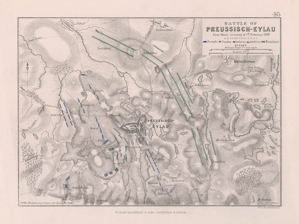 Immerse yourself in the dramatic history of the Napoleonic Wars with AK Johnston’s compelling "Battle of Preussisch-Eylau: first sheet - evening of 7 February 1807." This hand-colored antique lithograph transports viewers to one of the most fiercely contested events of the age, capturing the tense clash between French and Russian forces during a frigid winter evening. Originally engraved by the celebrated W. & AK Johnston publishing house of Edinburgh, this battle plan was created for Sir Archibald Alison's renowned "History of Europe" atlas—an essential work for understanding the military and geopolitical upheavals that shaped the continent from 1789 to 1815.