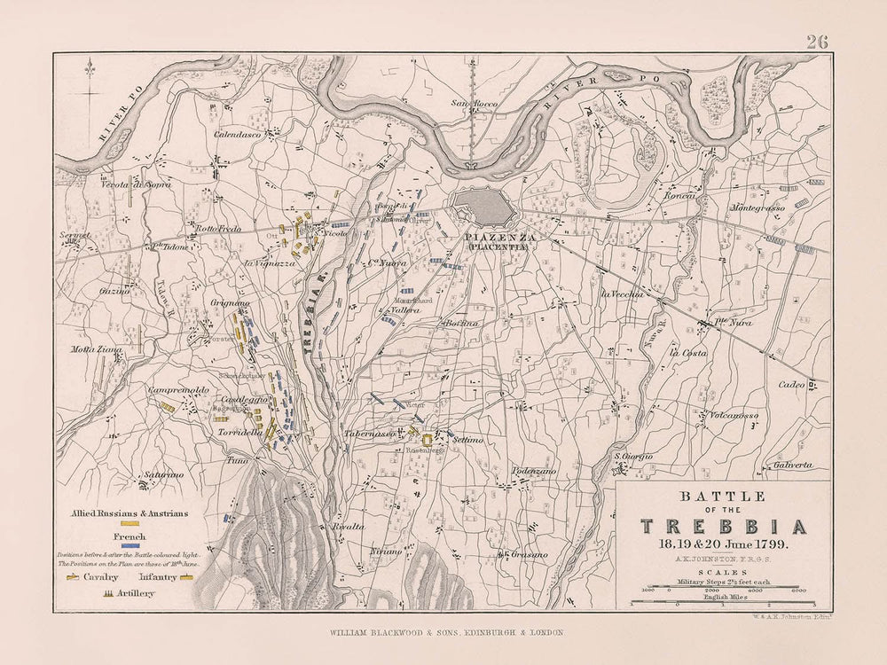 AK Johnston, cuya obra abarca una época de gran documentación militar y geográfica, era famoso por crear mapas detallados y de gran valor pedagógico. La "Batalla de Trebbia" es una de esas raras obras que no solo presenta precisión geográfica, sino que también captura la esencia de la guerra del siglo XVIII con estilo artístico.