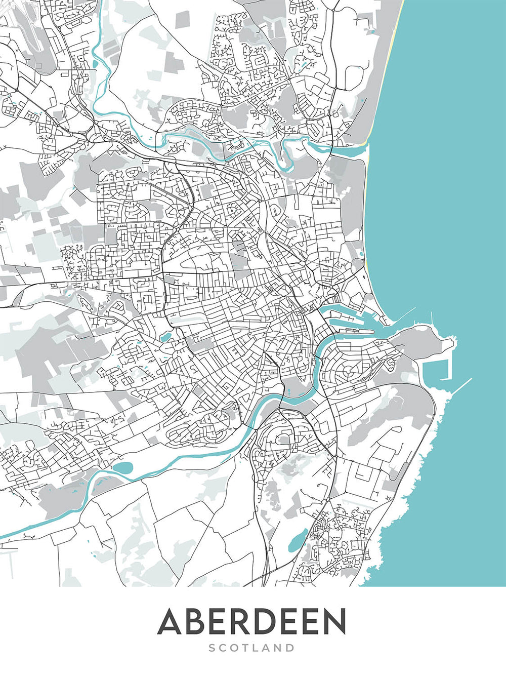 La inclusión de lugares destacados como Aberdeen Beach, Duthie Park y Marischal College añade una capa de profundidad a esta obra de arte. Estos puntos de referencia no son meros puntos en un mapa, sino símbolos del rico tapiz cultural e histórico de la ciudad. También se representan los ríos Dee y Don, que fluyen con gracia a través de la ciudad, añadiendo un elemento natural que contrasta maravillosamente con la estructura urbana estructurada. Esta combinación de características naturales y artificiales hace que el mapa sea una representación equilibrada del carácter único de Aberdeen.