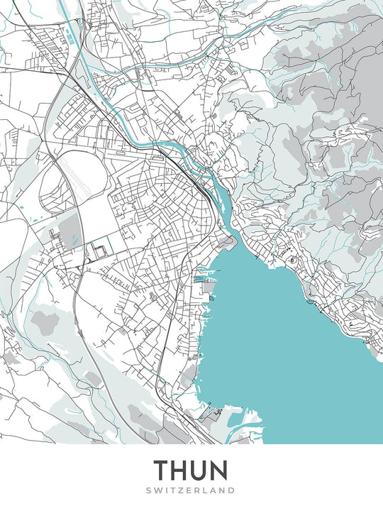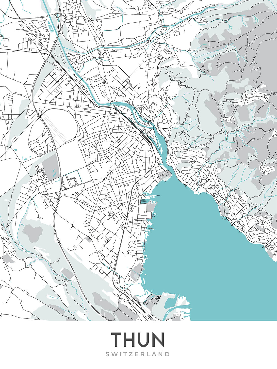 Este mapa de Thun, Suiza, es un mapa moderno y detallado de las calles sin etiquetas. Se centra en la ciudad de Thun y sus áreas circundantes, proporcionando una representación precisa y visualmente atractiva de la región. El mapa cubre una parte significativa de la ciudad, incluyendo varios vecindarios, carreteras principales y lugares emblemáticos.