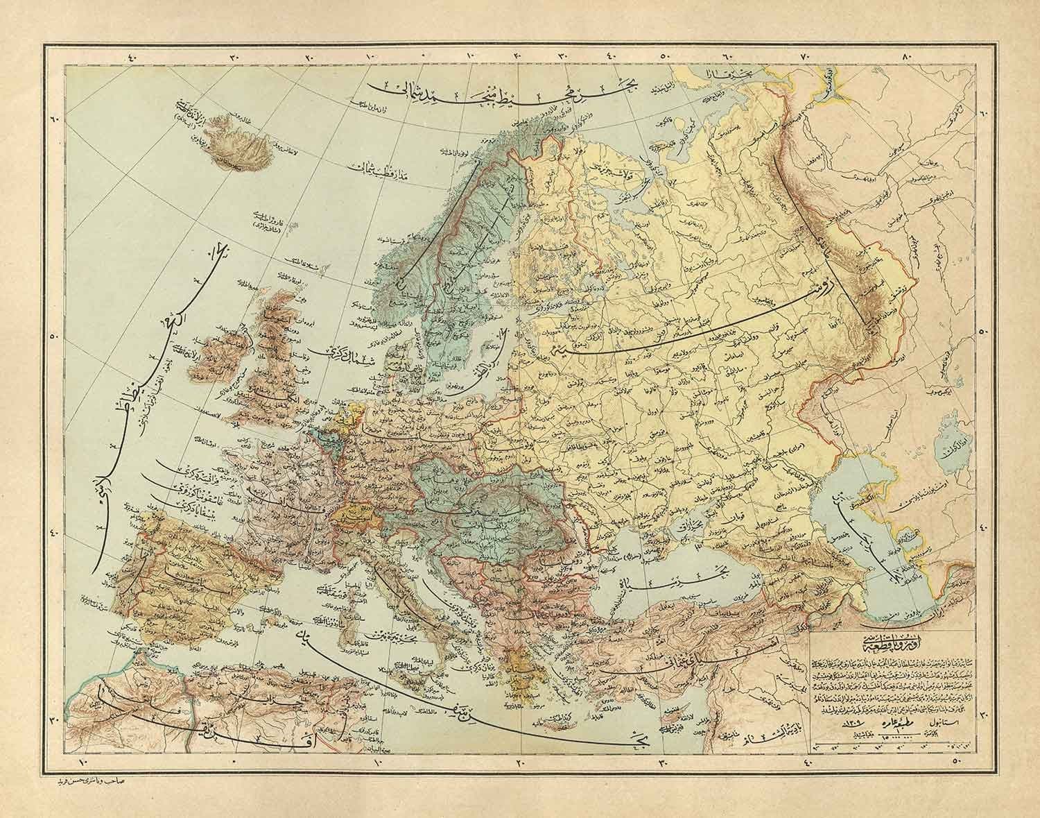 Antiguo mapa árabe de Europa por Hafız Ali Eşref, 1893: Reino Unido, Francia, Alemania, España, Imperio Otomano, Turquía, Rusia.