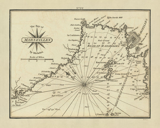El mapa está orientado con el noreste en la parte superior, una característica única que resalta la atención de Heather a las necesidades de navegación específicas de los marineros de la época. Detalla meticulosamente la vibrante bahía y ciudad de Marsella. La inclusión de sondas, características topográficas y anclajes mejora su utilidad y valor histórico, ofreciendo un vistazo a las defensas marítimas y rutas prevalentes durante esta era. La precisión del mapa en la representación de varios hitos naturales y artificiales, incluyendo el Massif des Maures y las Îles d'Hyères, subraya la importancia estratégica de esta región en la historia marítima.